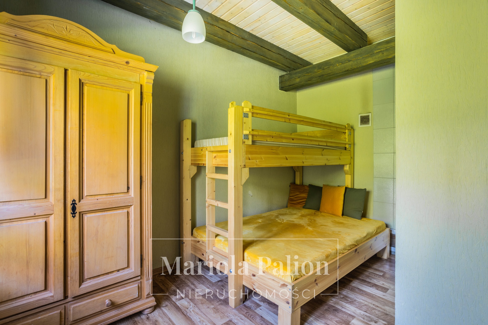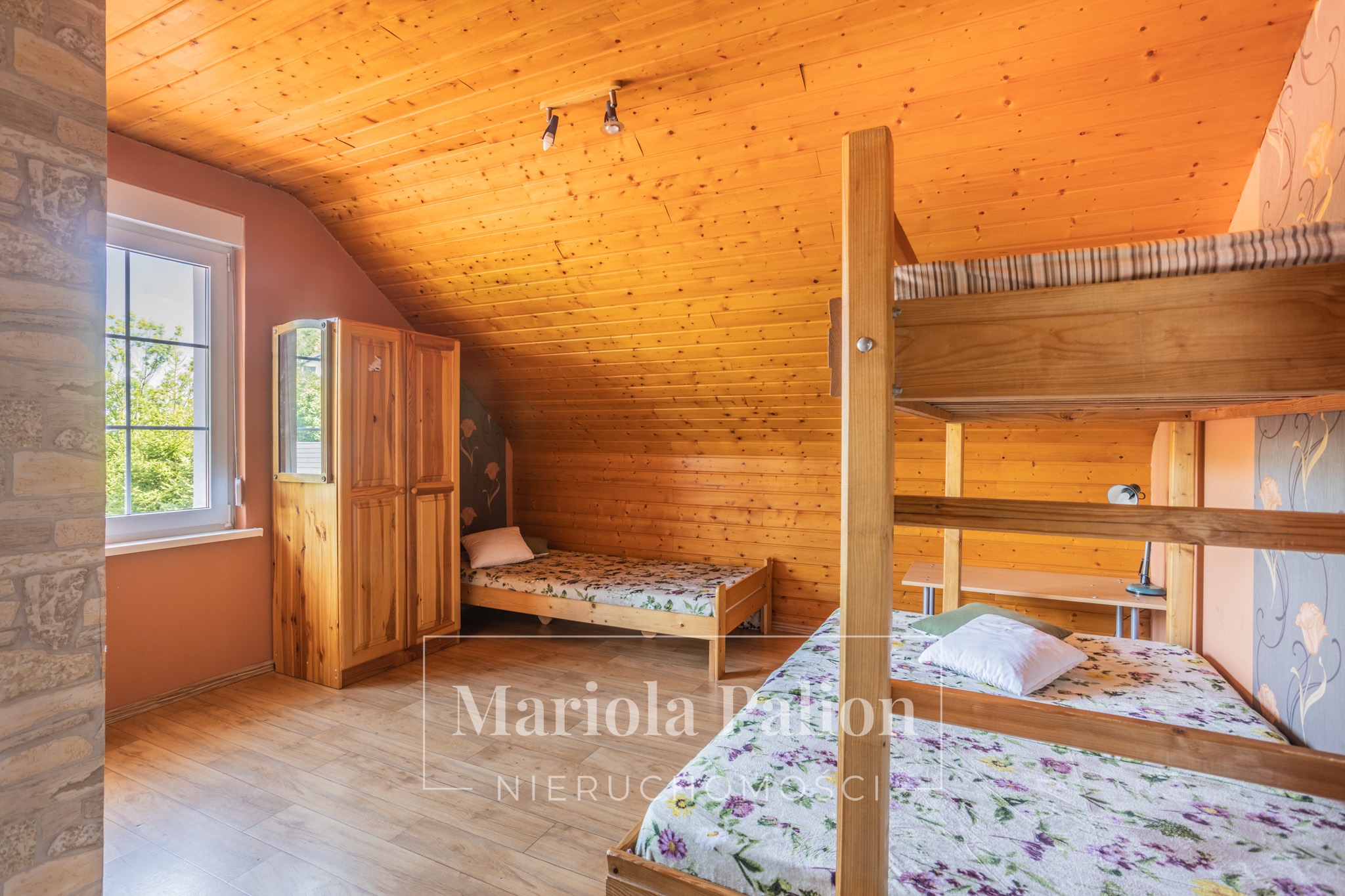 Dom gotowy do przyjęcia nawet 18 osób – w pokojach ustawione są solidne, drewniane łóżka.